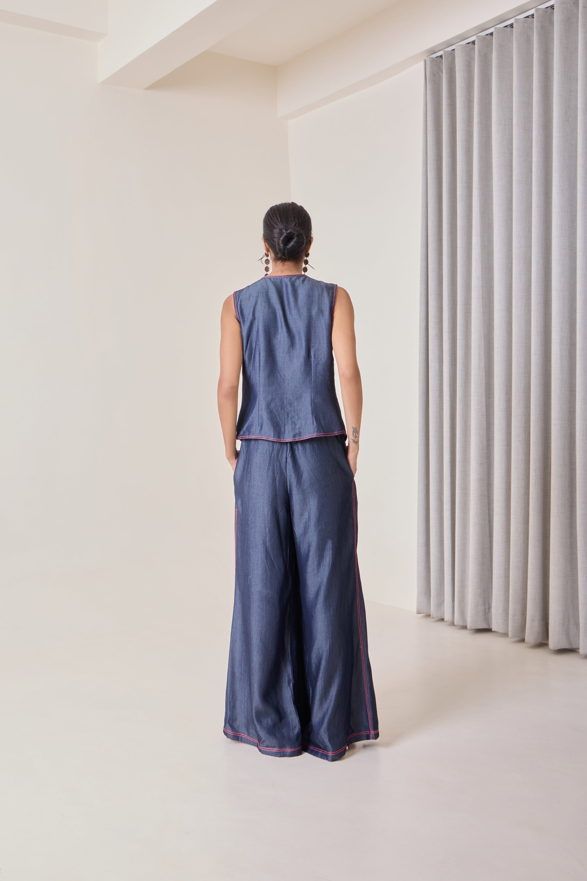 A statement denim vest crafted in 100% Tencel, featuring playful pink topstitching and laser-cut floral cutouts. Can be worn on its own for a bold party look or layered over tees, shirts, or dresses. Versatile, youthful, and designed for comfort — pairs effortlessly with the matching flared pants or anything in your wardrobe.