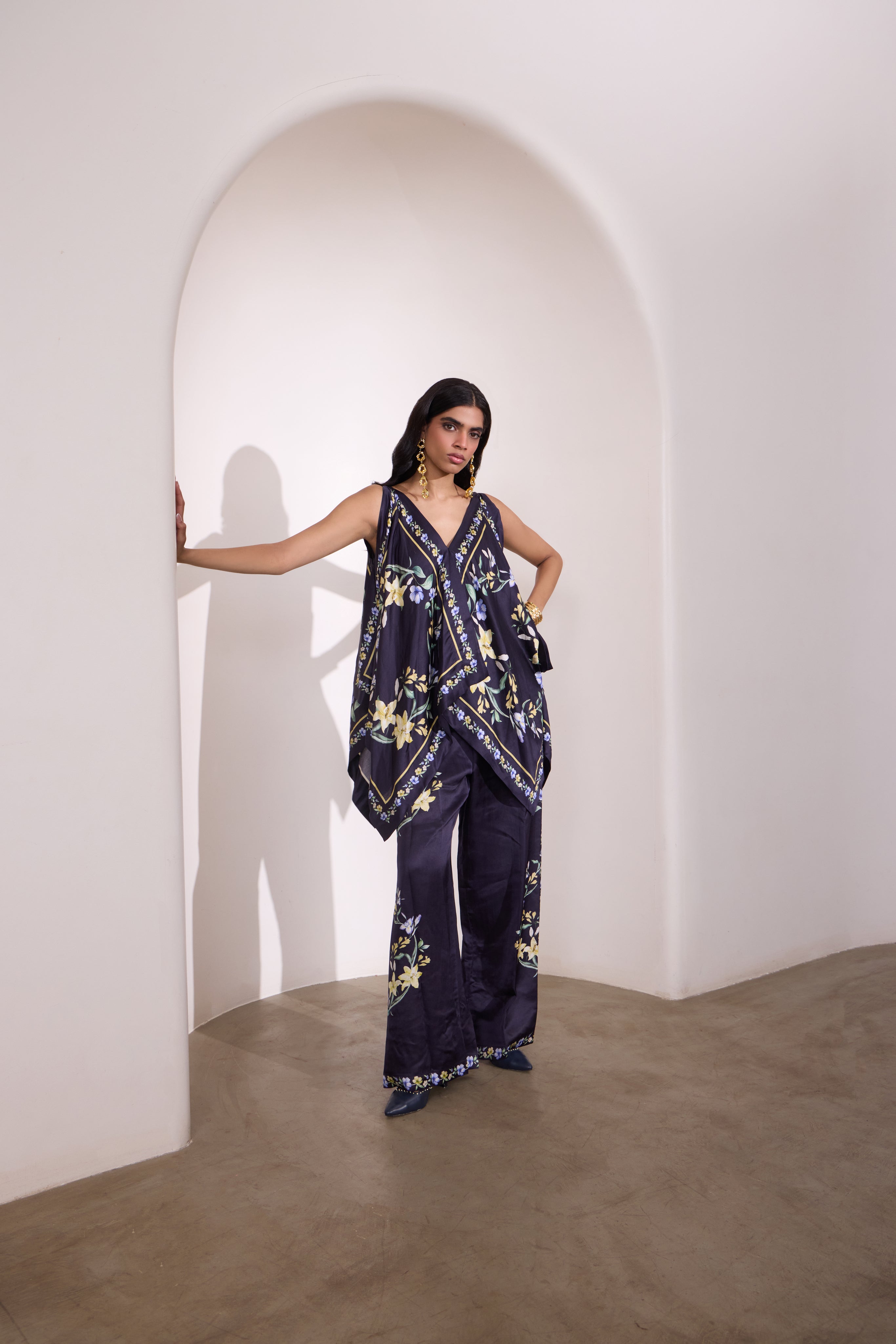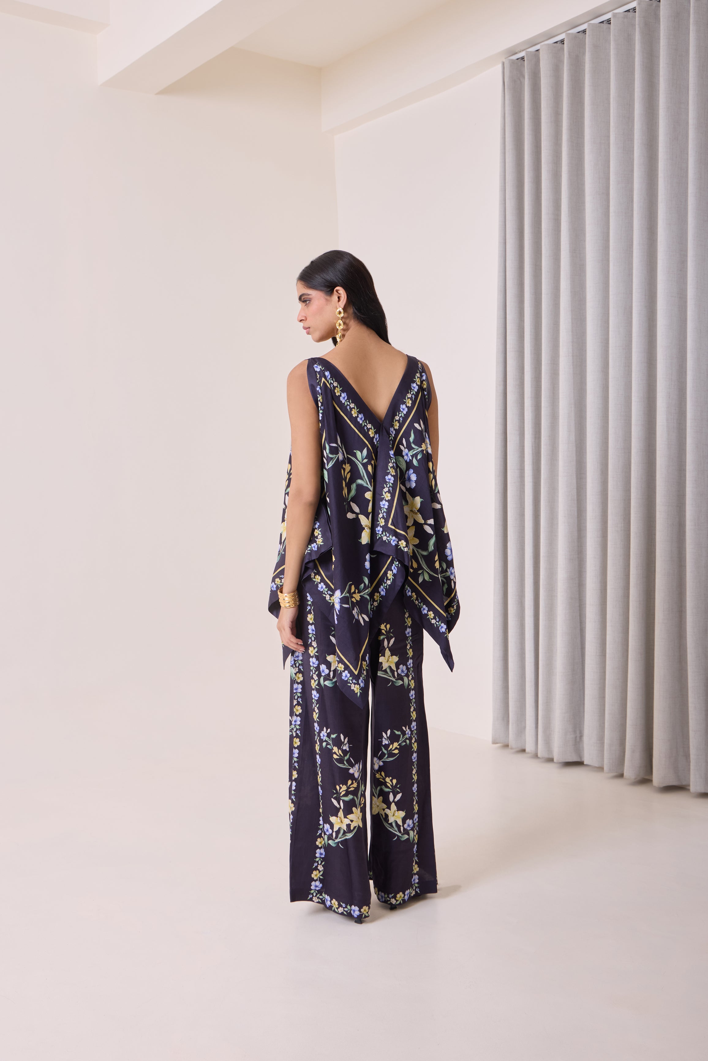 A playful scarf top in linen satin, featuring our signature floral placement print in navy tones. Designed with a fresh, youthful silhouette that ties effortlessly into both day and evening looks — modern, versatile, and easy to style.