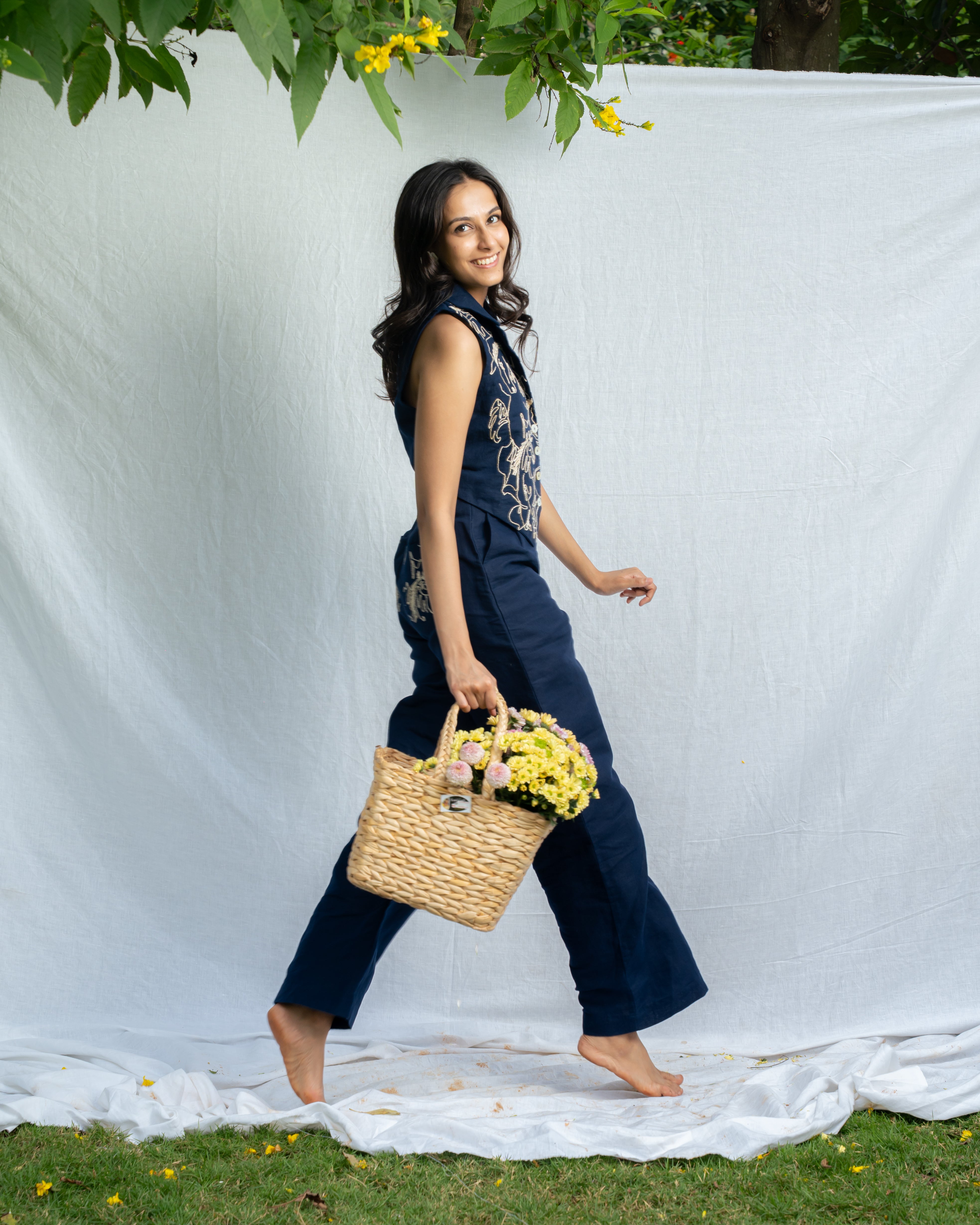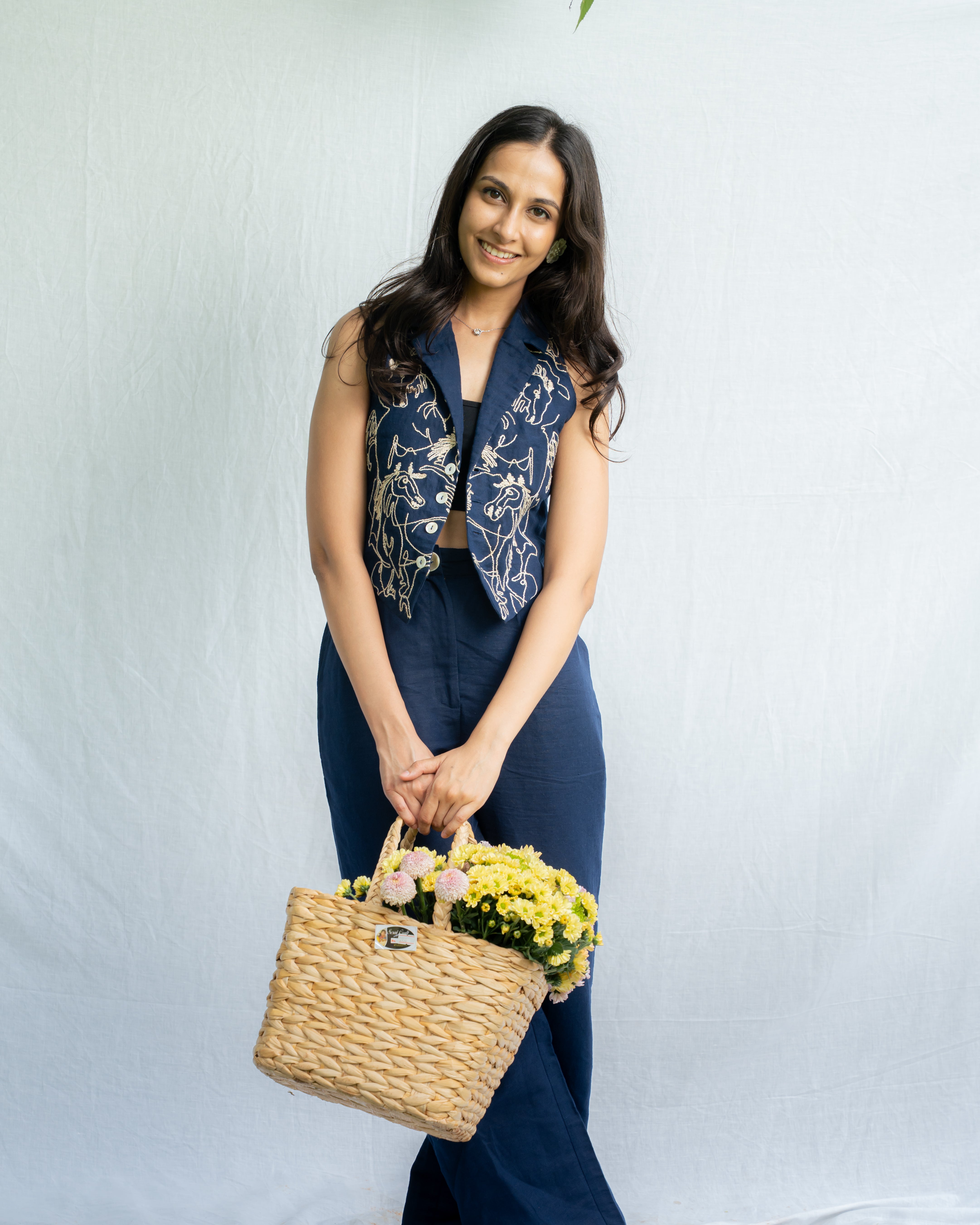 Cropped linen vest featuring a sharp collar and abstract horse hand embroidery, offering a smart, modern update to classic tailoring, making it very easy to dress up or down